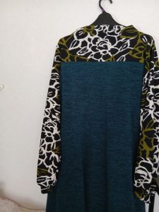 2月の新パターンです。ボトルネックワンピースです。袖がパフスリーブで可愛いですよ。裾が見えませんでしたが、ボーダーの方はパターン通りです。花柄の方は少し裾を狭くしています。柄と無地の組み合わせがいい感じです。