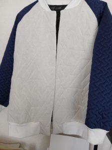 ラグランスリーブブルゾンです。ボタンはドットボタンにします。2種類のキルティング生地の組み合わせです。コートを作って多めに残った生地で作りました。