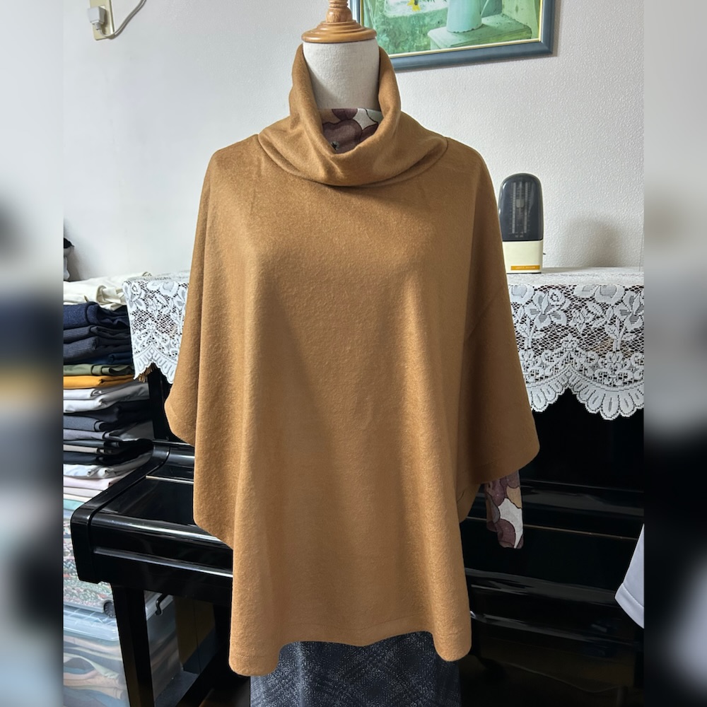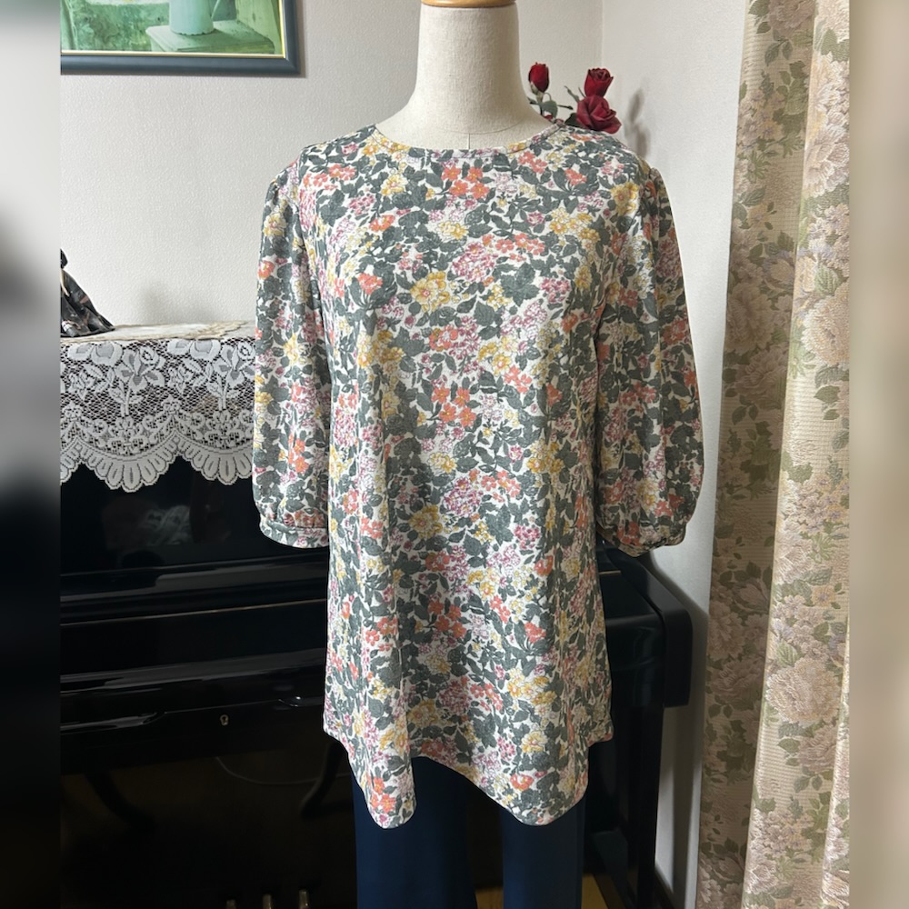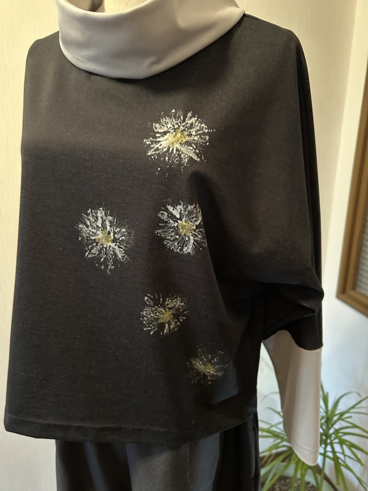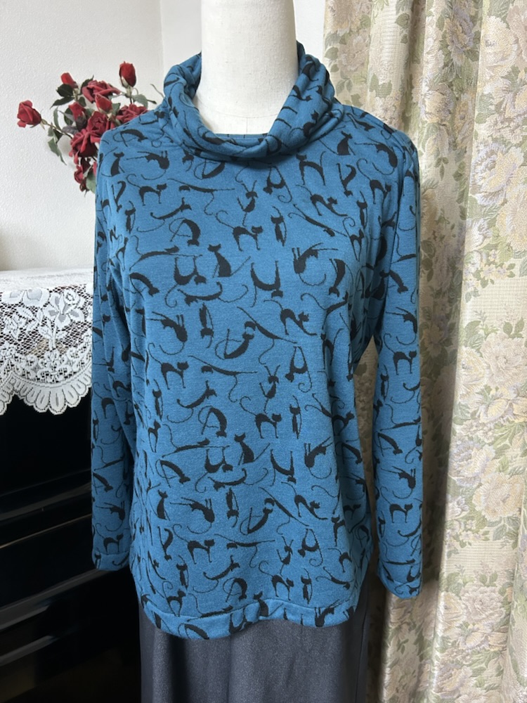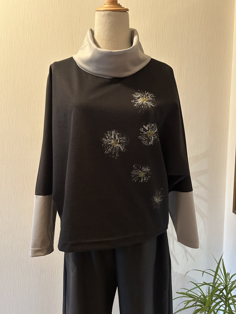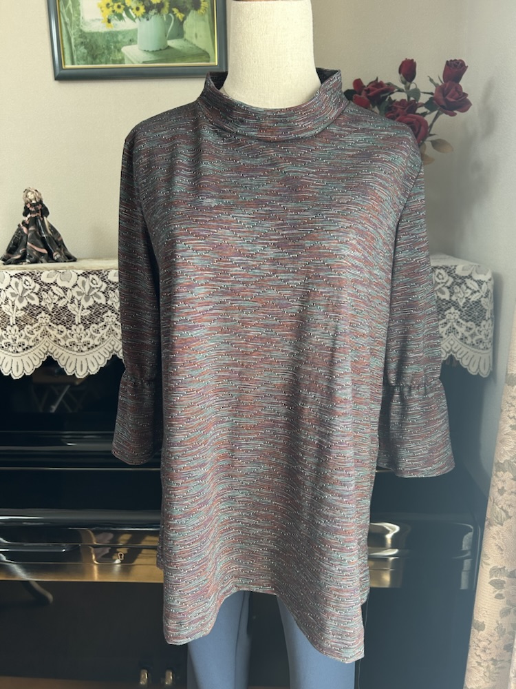 衿の縦ラインにゴムを使ってギャザーを入れたタートルネックのブラウス😊他の様々なアイテムとフィットする重宝なデザインです♪