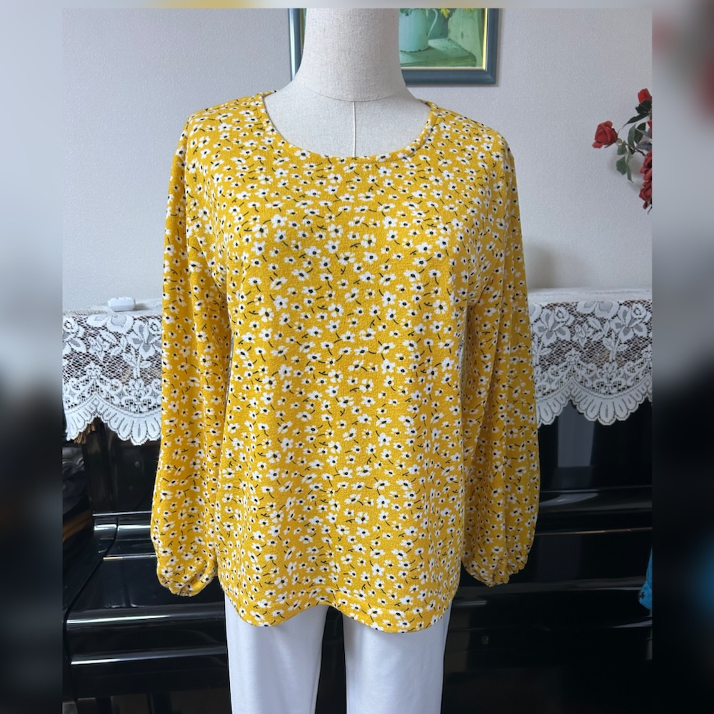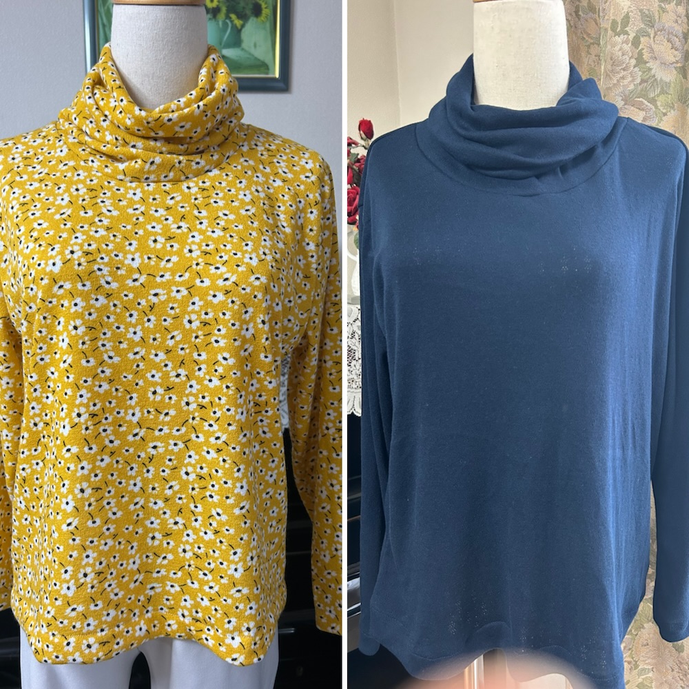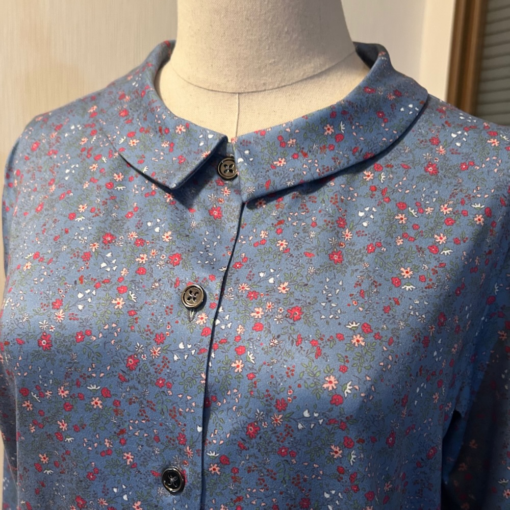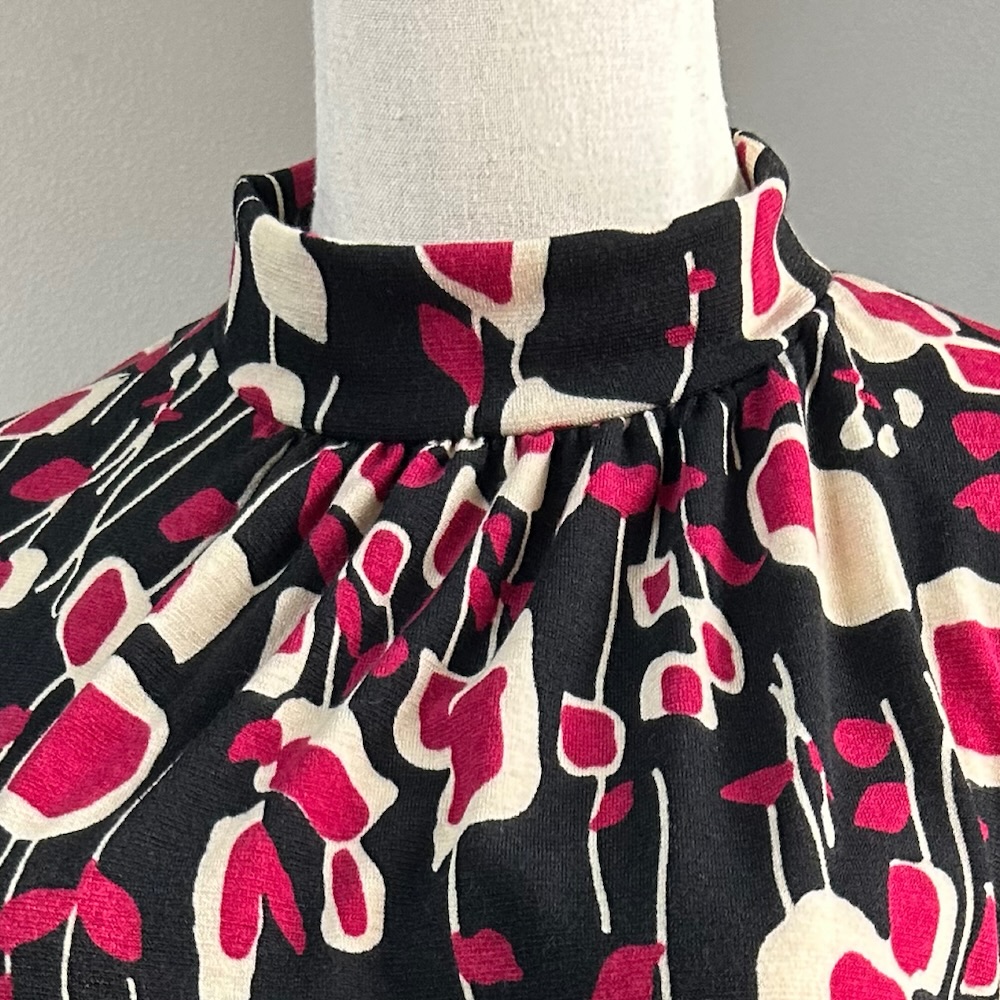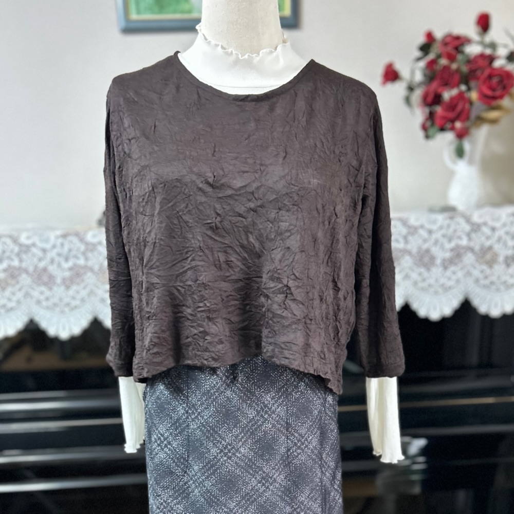 衿の縦ラインにゴムを使ってギャザーを入れたタートルネックのブラウス😊他の様々なアイテムとフィットする重宝なデザインです♪
