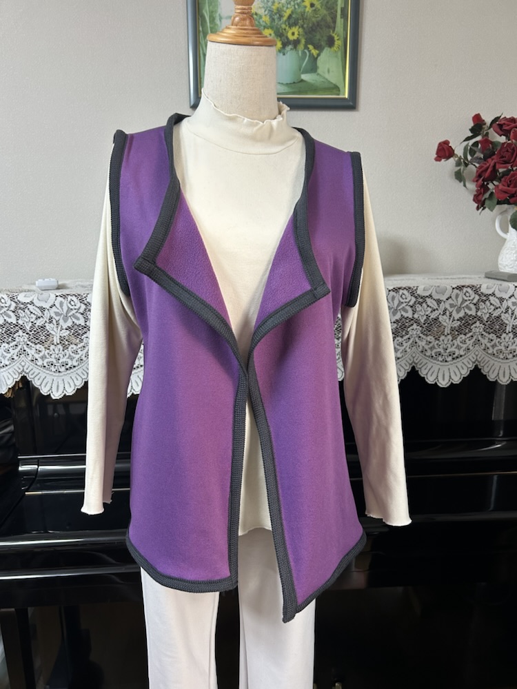 もこもこかわいいパッチワークジャカード生地で、長め丈のベストパターンLT-857のポケット付ベストのポケットなしバージョンを作ってみました!