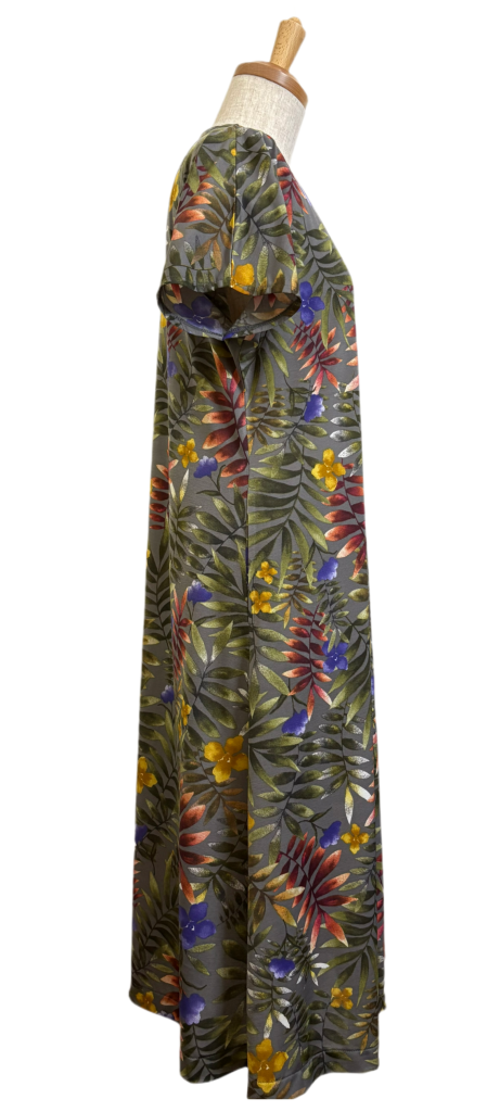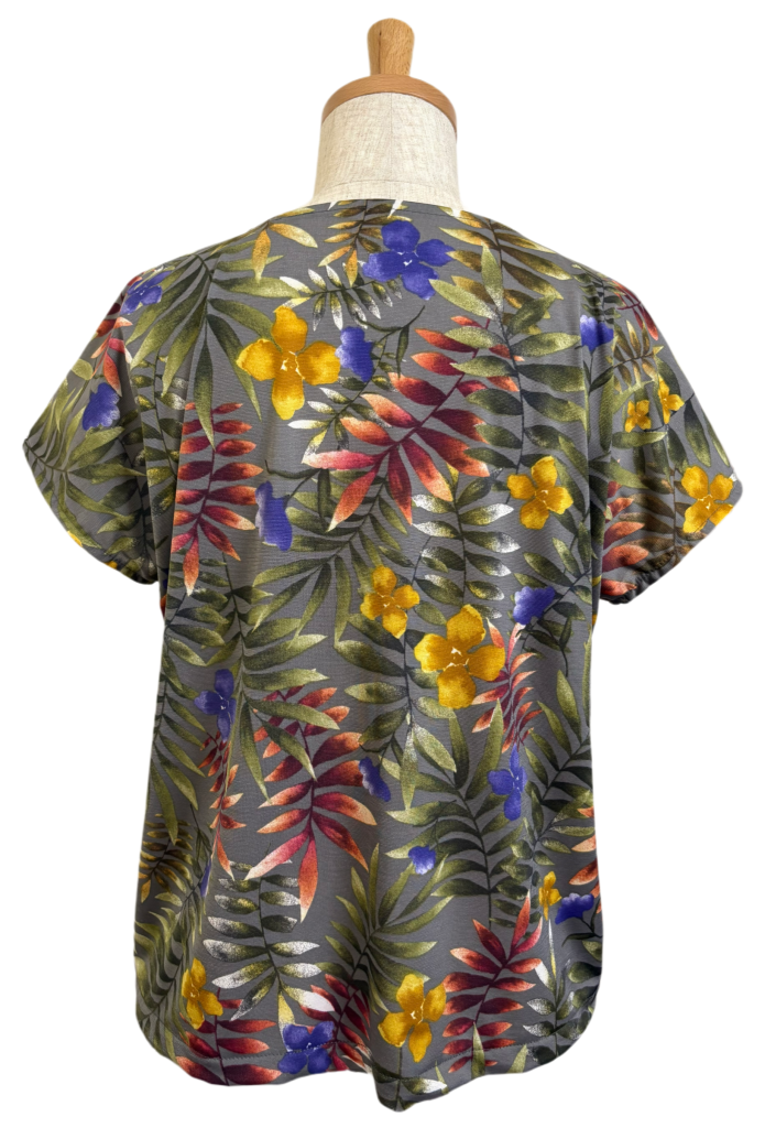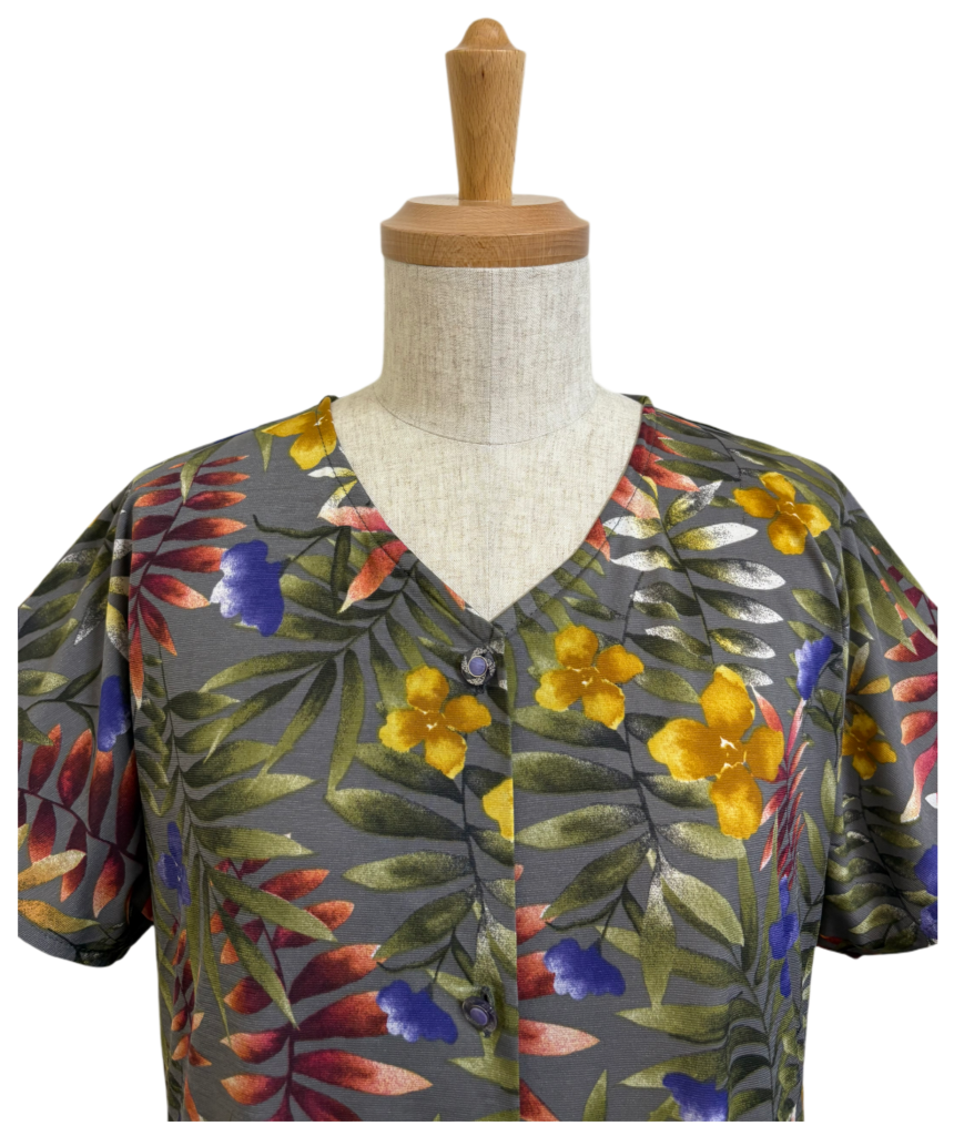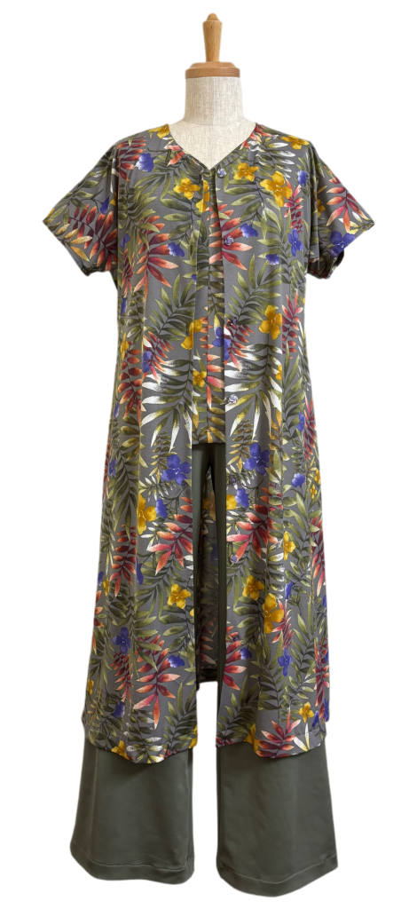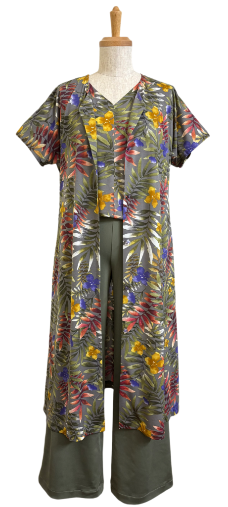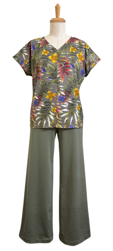 VネックTシャツはグレーの下地なのにリーフ柄がグリーンだからグリーンのパンツがピッタリ👍
