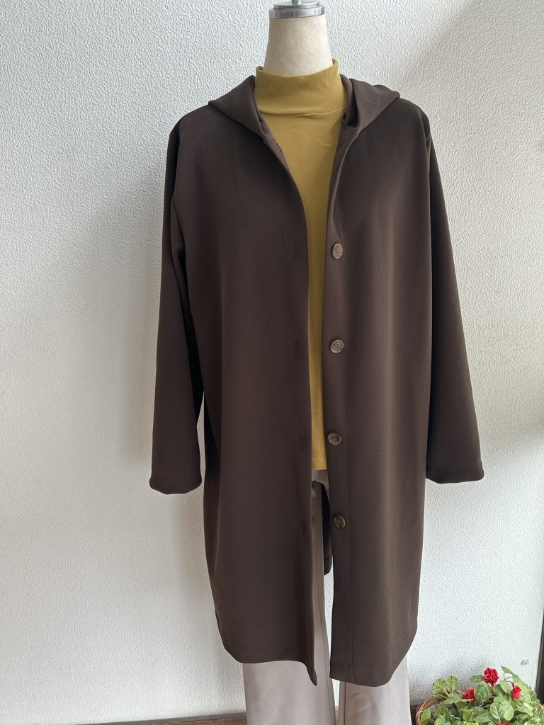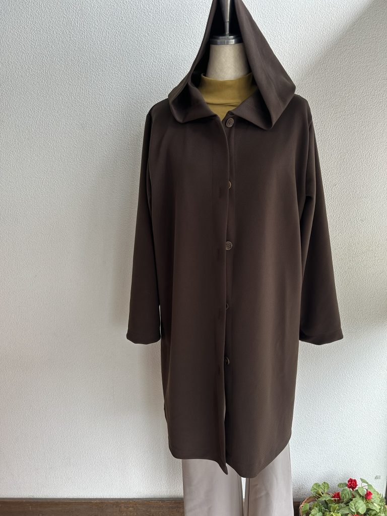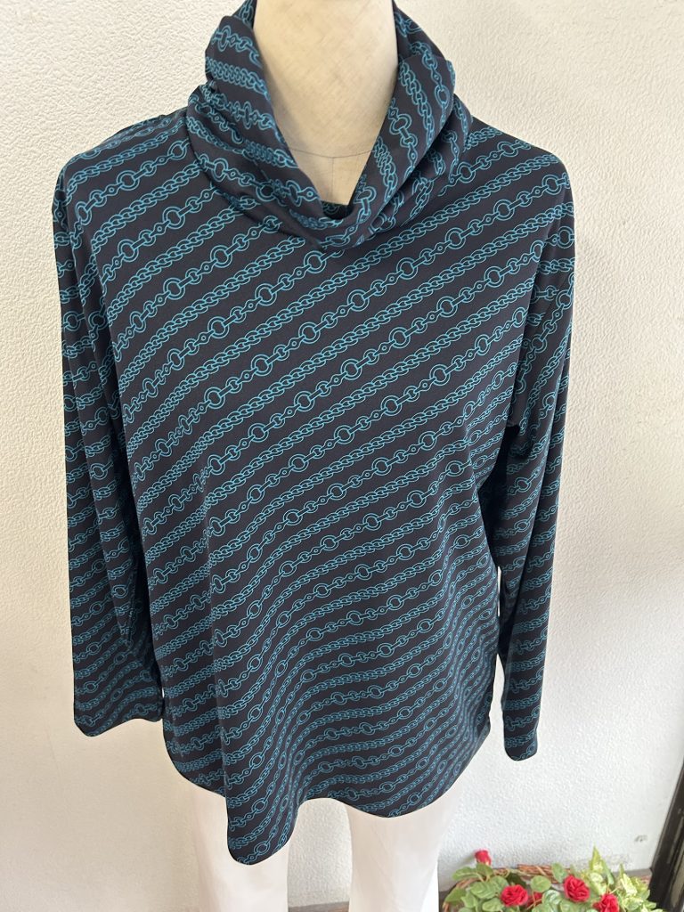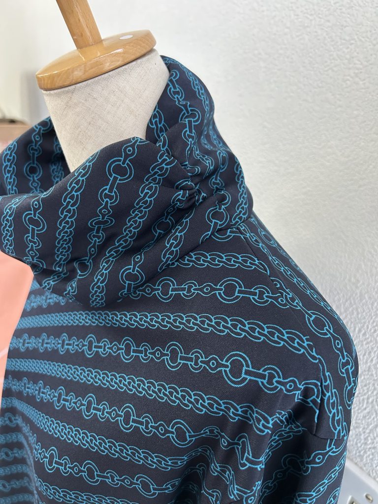 タートルネック衿で縦ラインにゴムを使ってギャザーが入った衿のブラウス