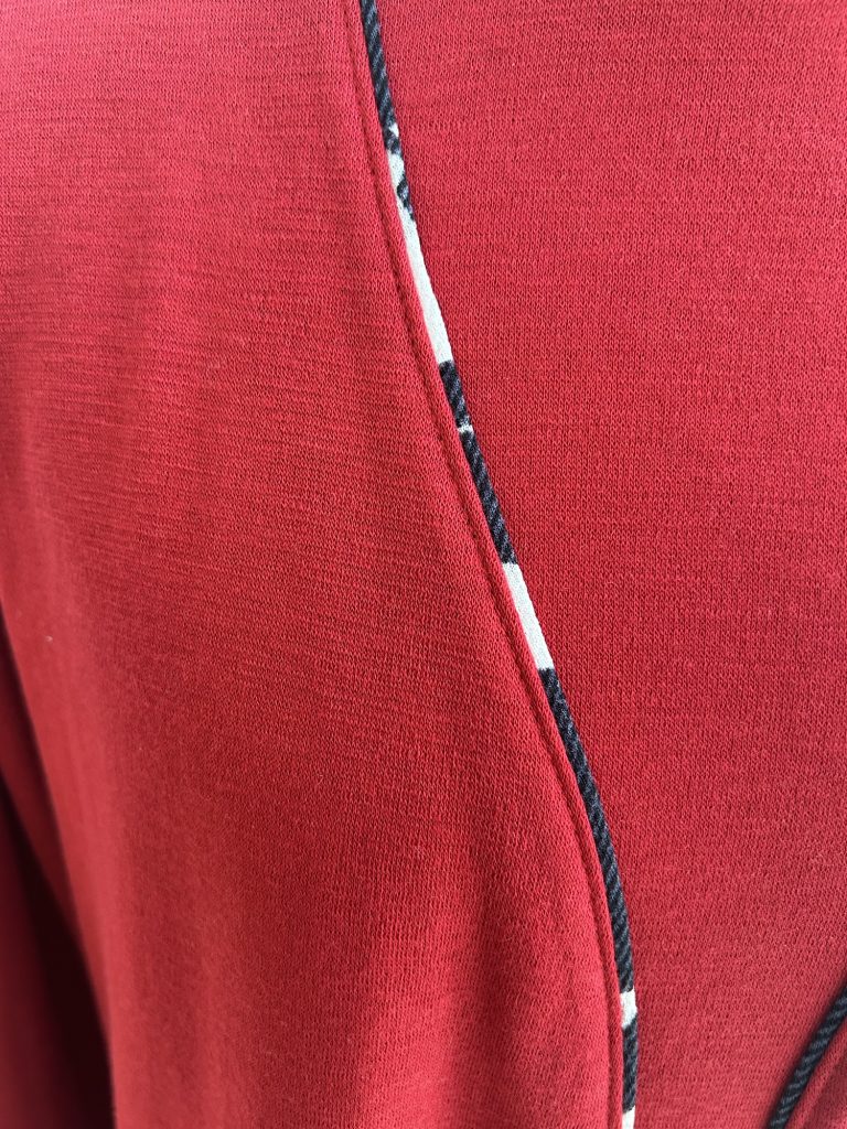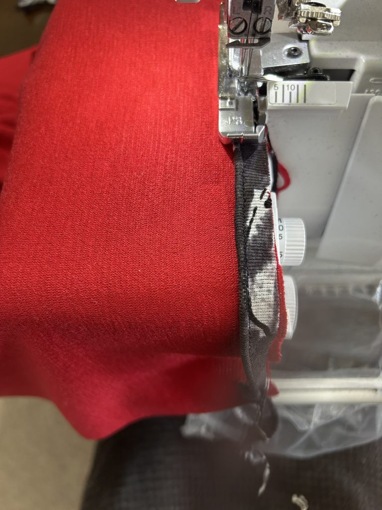 ②ロックミシンのアタッチメント押さえを使って見頃にパイピングテープと一緒に縫い最後に直線ミシンでステッチをかけて仕上がりです。