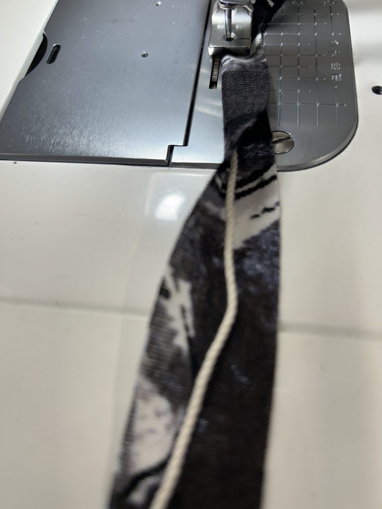 ①パイピング作り、タコ糸とテープを用意し、直線ミシンのアタッチメント押さえをパイピング押さえに換えてパイピングテープを作ります。