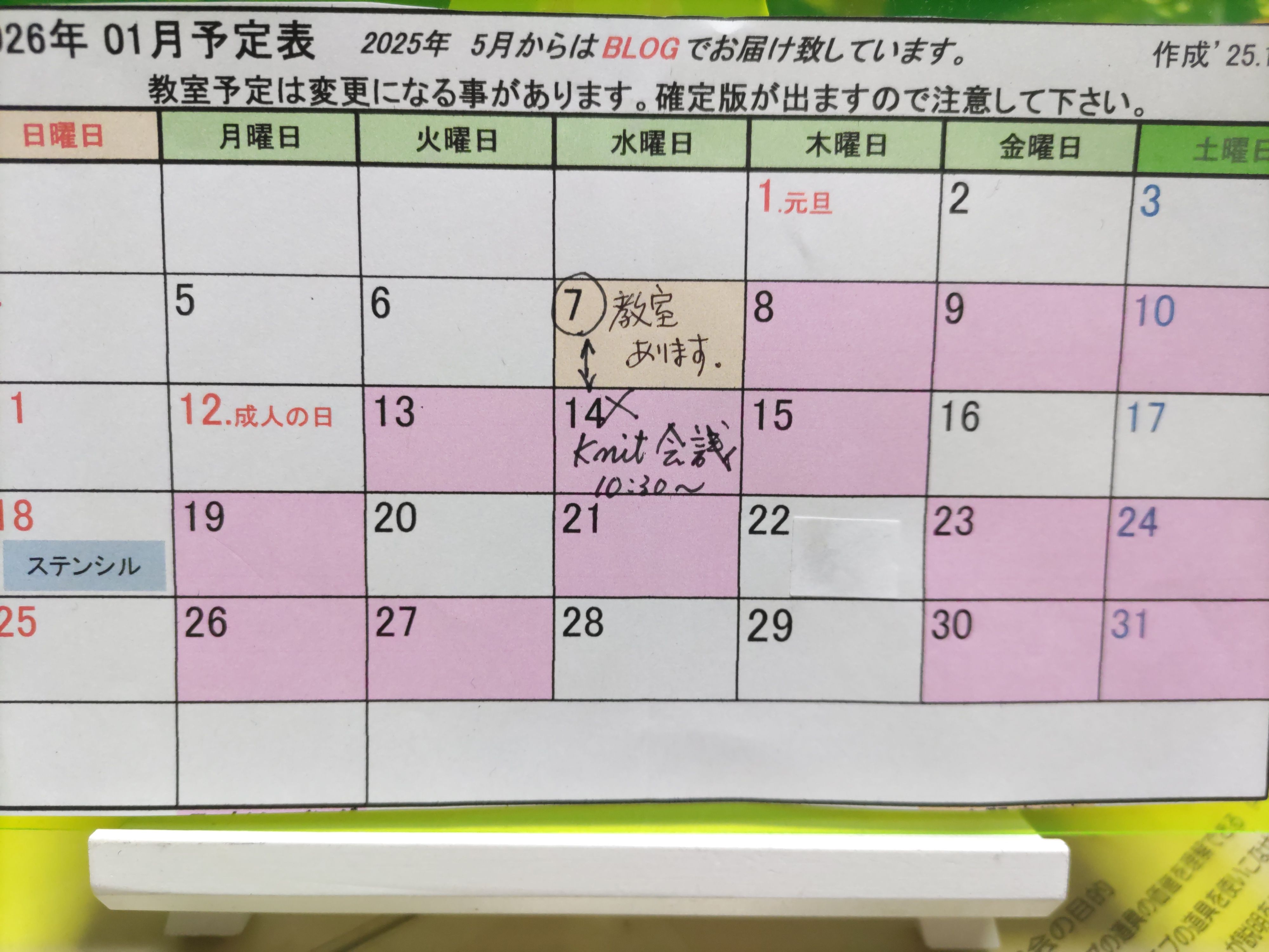 1月14日 (水)ニットリアル会議の為、教室はお休みです